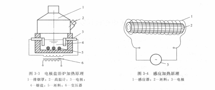 鹽浴爐加熱是電流通過爐內(nèi)電極產(chǎn)生的熱量把導(dǎo)電介質(zhì)熔融,通過高溫介質(zhì)的對流與傳導(dǎo)將埋入鹽介質(zhì)中的金屬坯料加熱,內(nèi)熱式電極鹽浴爐原理如圖3-3所示。這種方法加熱速度快,加熱溫度均勻,吋以實(shí)現(xiàn)金屬坯料的整體或局部的無氧化加熱,減少和防止氧化和脫碳現(xiàn)象。鹽浴表面熱輻射損失大,輔助材料消耗大,勞動條件差。